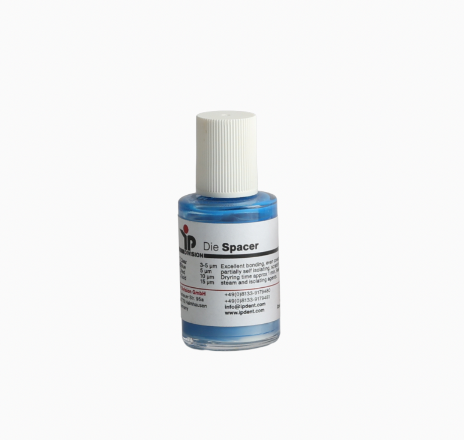 El IP Die Spacer es un barniz espaciador utilizado para crear el espacio óptimo necesario en el cementado de restauraciones dentales. Ofrece variedades en micraje y color para ajustarse a las especificaciones del laboratorio: transparente (3 µ), rojo (8 µ), azul (5 µ) y oro (15 µ). Su aplicación homogénea asegura un control exacto del grosor, favoreciendo un ajuste preciso de la prótesis y prolongando la durabilidad de la restauración. Presentación de 15 ml.